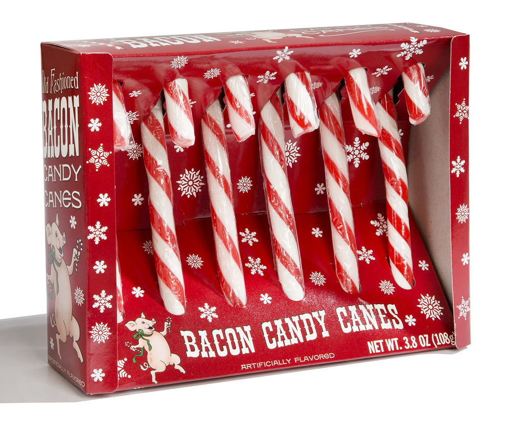 Details: When we told Santa Claus about these Bacon Candy Canes he nearly fell out of his sleigh. Then he let out a jolly guffaw and thanked us for saving Christmas. Not too bad for a days work! Six 5-1/4" (13.3 cm) tall, bacon-flavored canes in each illustrated box. Shrink wrapped.