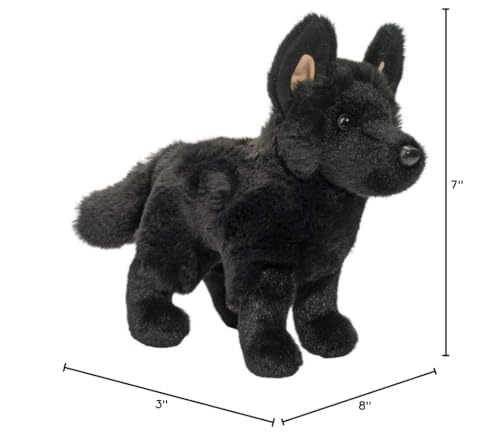 Details: The solid black coat of Harko the plush German Shepherd gives him a noble, stately look that has earned him many fans! An uncommon color variation of the better known black and tan Shepherds, these handsome coal colored dogs feature all the intelligence and loyalty you'd expect from a Shepherd with the usual colors! Crafted in ultra soft plush fur, it's easy to see why Harko's black coat is his pride and joy. Large, alert ears with pale fabric interiors along with a bright eyed glance reveal Harko's bold personality. With an engaging stand up pose and winsome looks, Harko the Black German Shepherd stuffed animal is a must for fans of this gallant breed!