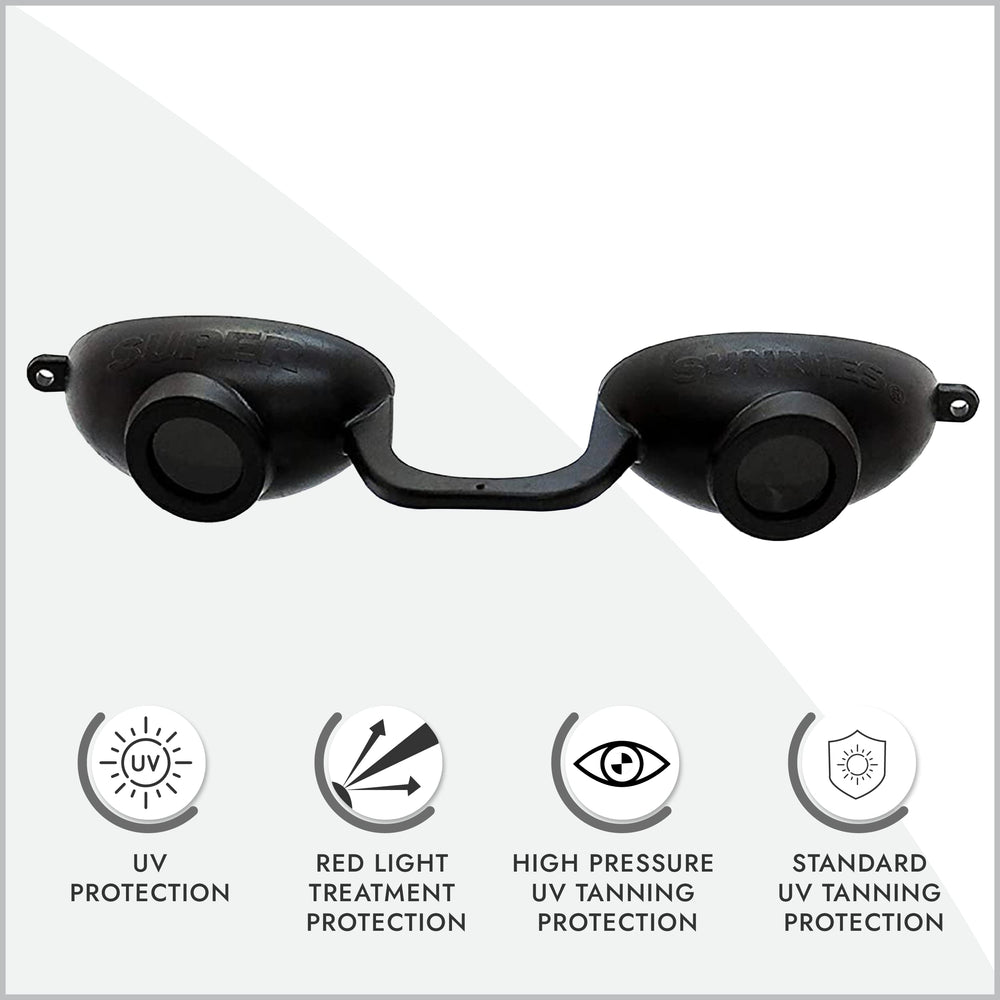 Super Sunnies tanning goggles offer a great protection for your eyes both indoors and outdoors. This Evo Tanning Eyewear has a flexible high-rise nose bridge to eliminate tan lines. The tanning glasses have an elastic band to assure the perfect fit.
